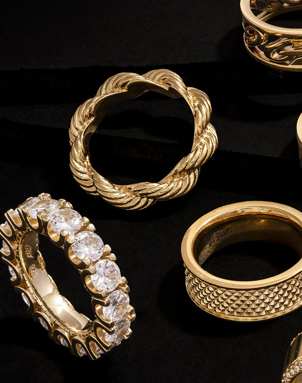 A ring is the one piece of jewelry you see every time you move your hand, which is why finding the right one matters. GLD's ring collection brings together every major ring style in one place, from clean band rings and chain-inspired Cuban link rings to fully iced eternity rings, bold signet rings, and statement engagement rings. Every gold ring is available in yellow gold, white gold, and rose gold, with material options spanning 18K gold plated, premium vermeil (.925 silver with 3 microns of 18K gold), moissanite, and solid gold (10K and 14K) through the GLD Premium collection.