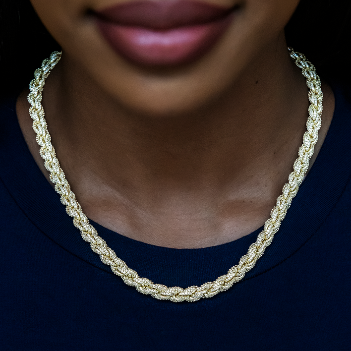 The 8MM Diamond Rope Necklace in Yellow Gold takes classic shine to the next level. Covered in hand-set stones and finished in rich 18k gold plating, this stunning piece is built to flex solo or layer heavy for maximum impact.