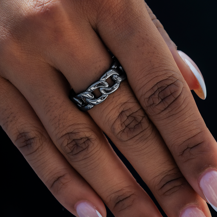 The 7MM Cuban Band Ring in Matte Black puts an edge on classic link styling. With its bold silhouette and matte finish, this ring is built to turn heads while keeping things clean. Whether you’re stacking or rocking it solo, it delivers effortless drip with everyday wearability.