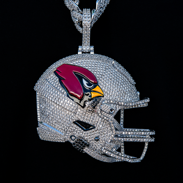 GLD has teamed up with the National Football League to introduce the official NFL Team Giant Helmet Pendants. This made to order Giant Helmet piece is meticulously crafted in 14k White Gold with hand-set stones to accurately depict the helmet of the Cardinals. Flex this NFL season with this official Giant Helmet pendant of the Arizona Cardinals!