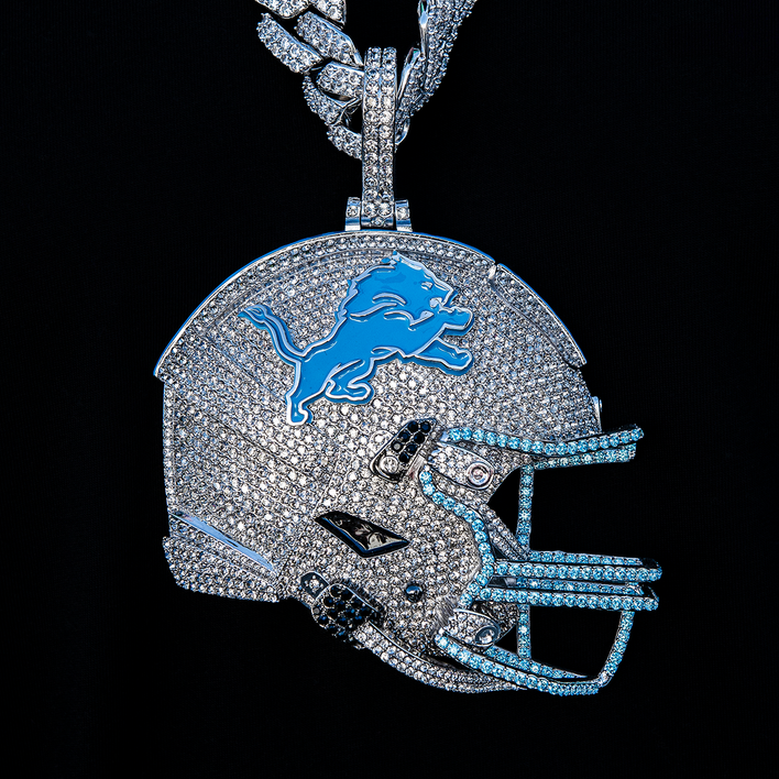 GLD has teamed up with the National Football League to introduce the official NFL Team Giant Helmet Pendants. This made to order Giant Helmet piece is meticulously crafted in 14k White Gold with hand-set stones to accurately depict the helmet of the Lions. Flex this NFL season with this official Giant Helmet pendant of the Detroit Lions!