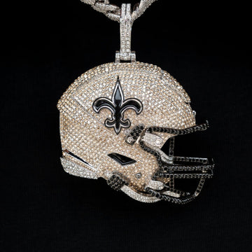 GLD has teamed up with the National Football League to introduce the official NFL Team Giant Helmet Pendants. This made to order Giant Helmet piece was meticulously crafted in 14k White Gold with hand-set stones to accurately depict the helmet of the Saints. Flex this NFL season with this official Giant Helmet pendant of the New Orleans Saints!