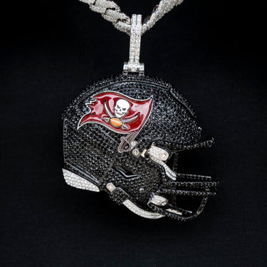GLD has teamed up with the National Football League to introduce the official NFL Team Giant Helmet Pendants. This made to order Giant Helmet piece was meticulously crafted in 14k White Gold with hand-set stones to accurately depict the helmet of the Buccaneers. Flex this NFL season with this official Giant Helmet pendant of the Tampa Bay Buccaneers!