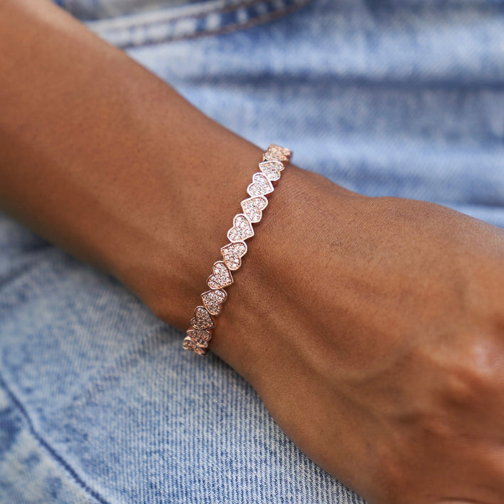 Do you wear your heart on your sleeve? Now you can keep a couple on your wrist with the Eternity Heart Cuff Bracelet in 14k Rose Gold. Classic for everyday wear with enough shine for special occasions, each heart is sprinkled with delicate pave hand-set diamonds.