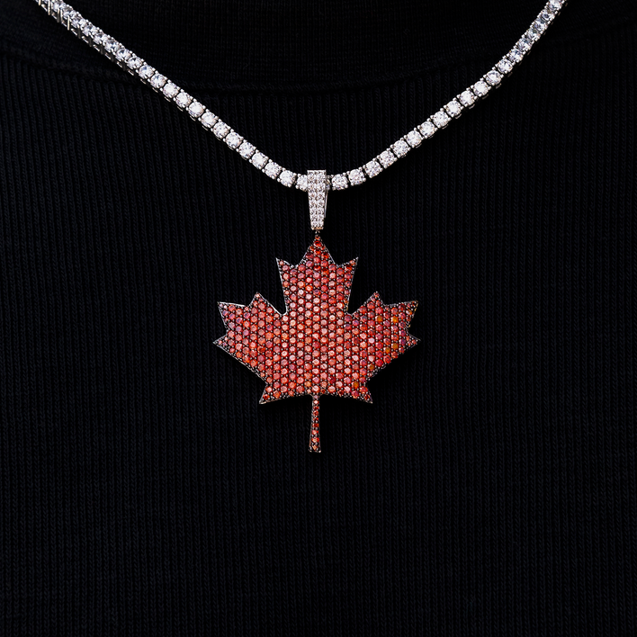 Introducing the Iced Canada Pendant in 14k White Gold. This piece is crafted with high-quality materials and fully iced out with red hand-set stones that catch the light from every angle. Featuring the iconic maple leaf, it blends intricate design with a bold statement of pride. Embrace your Canadian spirit and shine bright with this exclusive pendant today!