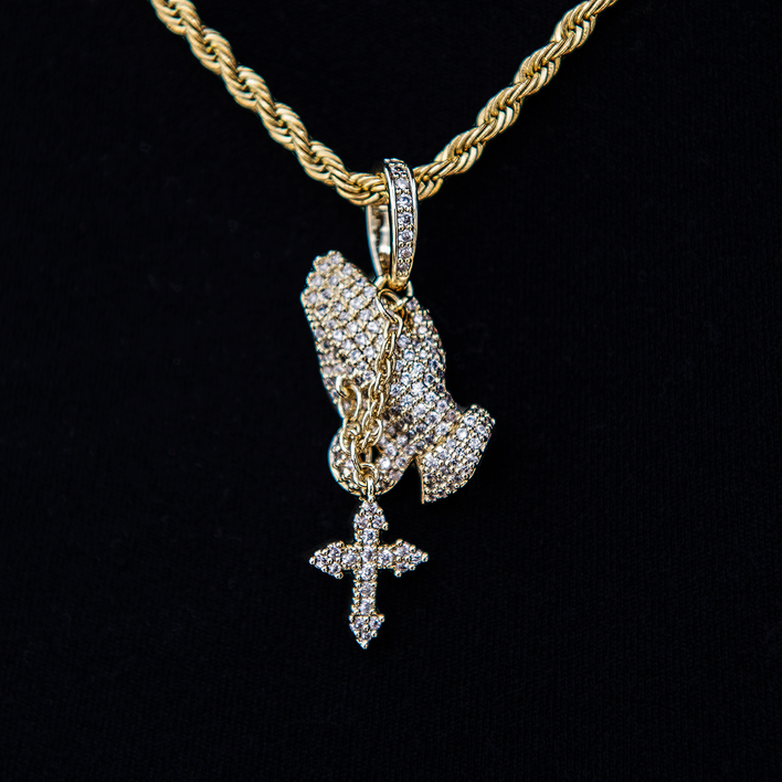 Micro Iced Praying Hands with Cross Pendant in Yellow Gold