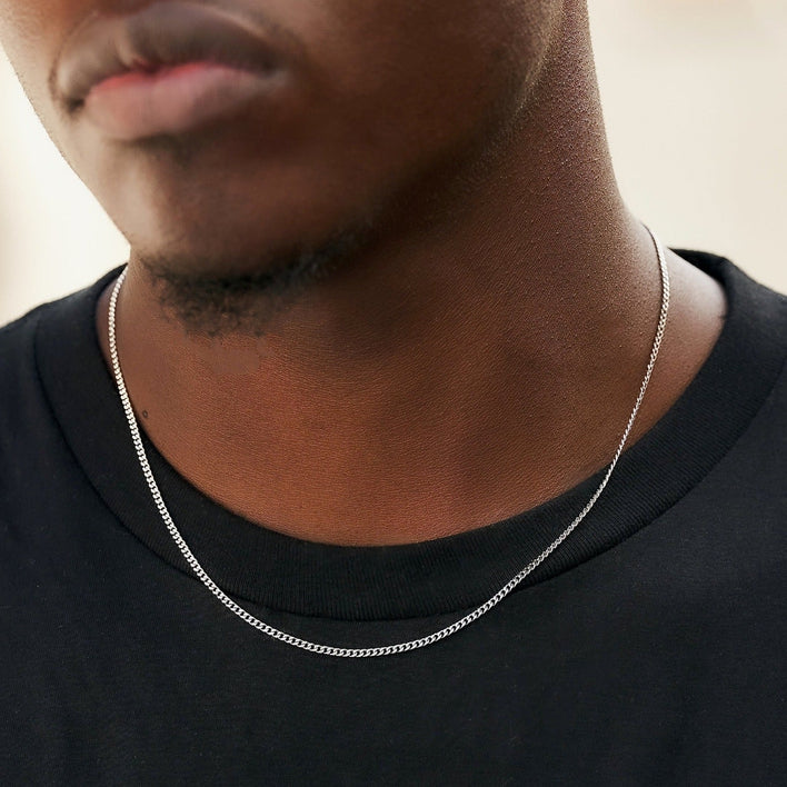 Introducing the Micro Cuban Chain in White Gold- 2mm, a small chain with big impact. The classic Cuban links and everyday feel make it a must-have addition to your collection. Whether you're dressing up or keeping it casual, elevate your style with this delicate White Gold polish over stainless steel piece.
