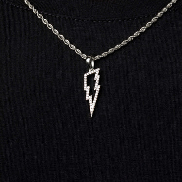 Introducing our "Micro Iced Lightning Bolt Pendant in White Gold" , this pendant features a hollow center and stones on the full piece except the bail. Styled with our "2mm Rope Chain In White Gold" they make the perfect pair. Wear it alone or style it with multiple chains for a layered look, this piece is the perfect touch of ice!