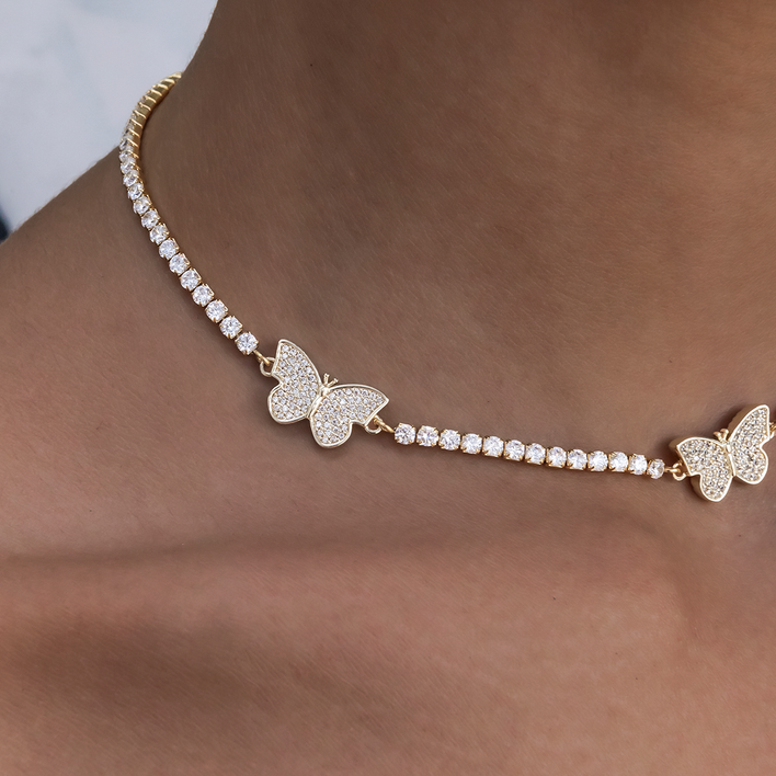 Re-introducing our Micro Tennis Butterfly Necklace in 18k Yellow Gold. Carefully crafted and designed, this adjustable piece features iced out stationed butterflies on our best-selling micro tennis chain. Perfect for pairing with a casual day look or fun night outfit, this piece is guaranteed to elevate your whole look. Get yours now!