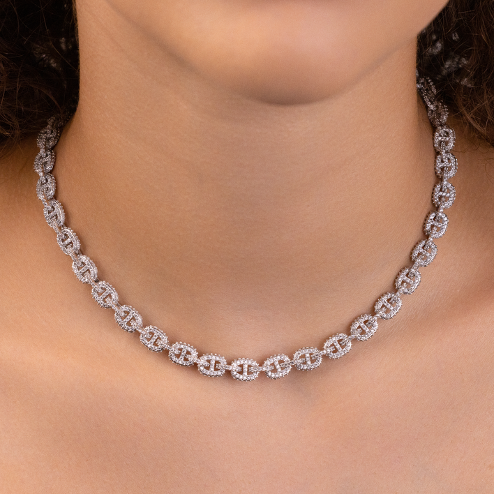 Introducing the Micro Valentina Necklace in White Gold, these connected valentina links are fully iced in pave hand-set stones, designed to catch the light from every direction. Pair this 14k White Gold Plated chain with the matching Micro Valentina Bracelet for the perfect set!