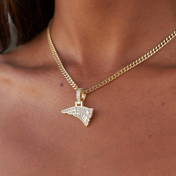 GLD has teamed up with the National Football League to introduce the official NFL Team Pendants. This piece was meticulously crafted with 18k yellow gold and clear hand-set stones to accurately depict the logo of the Patriots. Flex this NFL season with the official pendant of the New England Patriots.