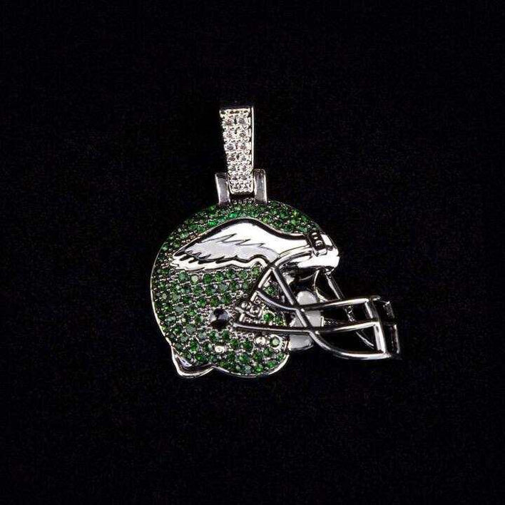 GLD has teamed up with the National Football League to introduce the official NFL Team Helmet Pendants. This piece was meticulously crafted with a green hand-set stones along with gray and white enamel to accurately depict the helmets of the Eagles. Flex this NFL season with the official pendant of the Philadelphia Eagles.