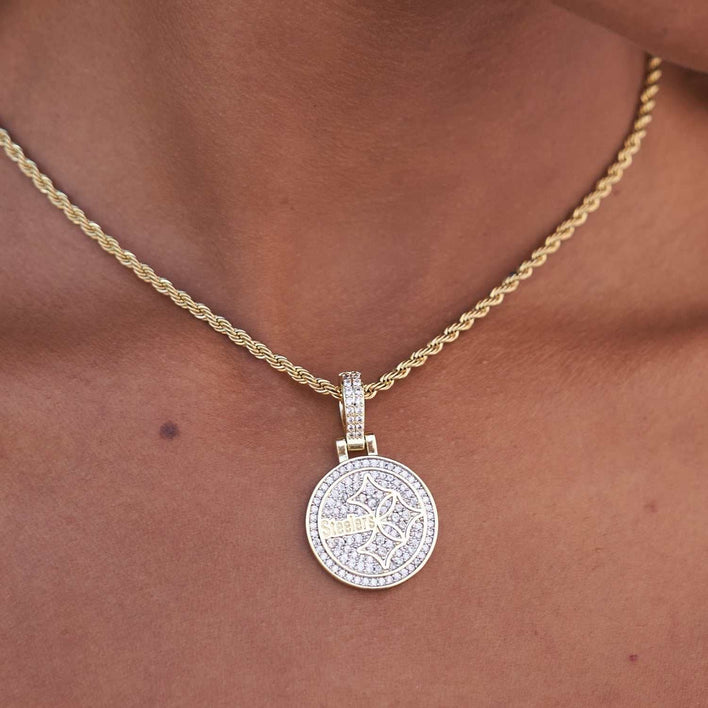 GLD has teamed up with the National Football League to introduce the official NFL Team Pendants. This piece was meticulously crafted with 18K gold and clear hand-set stones to accurately depict the logo of the Steelers. Flex this season with the official pendant of the Pittsburgh Steelers.