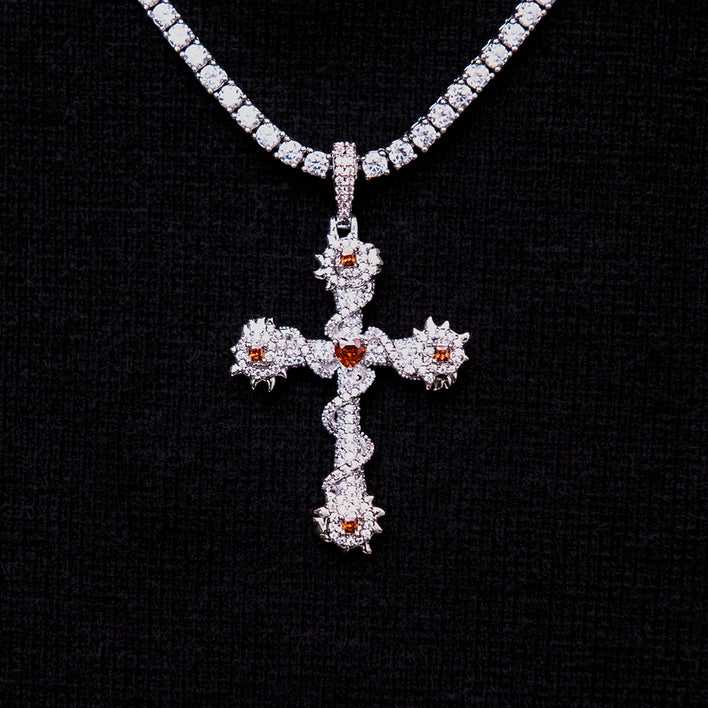 Introducing the Iced Spiked Cross Pendant featuring ruby hand-set stones. This head-turning piece is fully iced out, crafted in 14k White Gold, and features a spiked vine wrapped around the entire cross. Rock it with our 3mm Diamond Tennis Chain for the perfect drip to upgrade your fit!